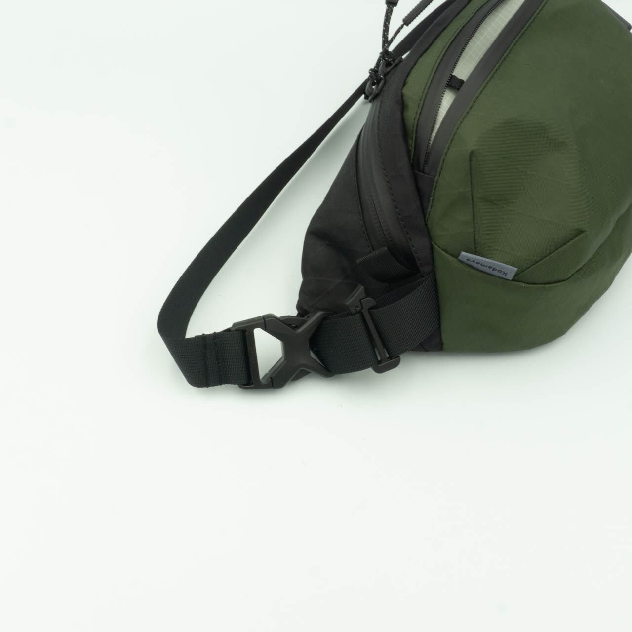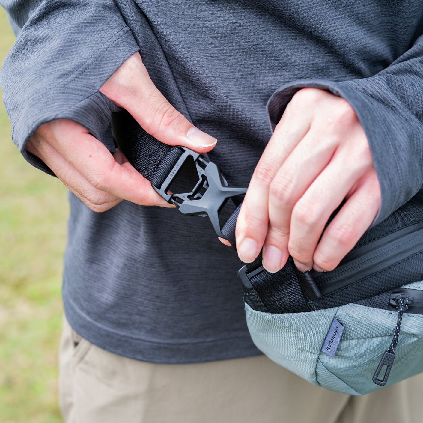 KODAMAYA StreamLine Systemはバック横のバックルで着脱を行いますが、長さ調整は反対側のカムバックルを使用することで バック側に部品を集め、バック裏側の隠しポケットに余ったベルトを収納することができます。